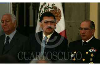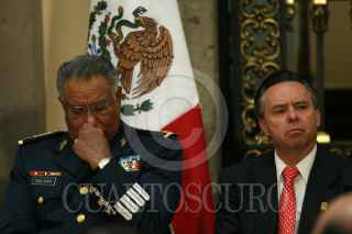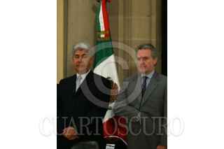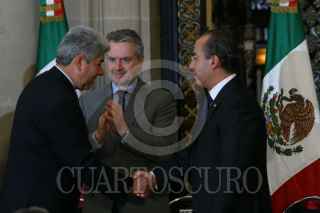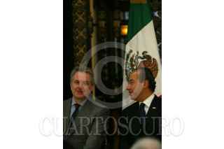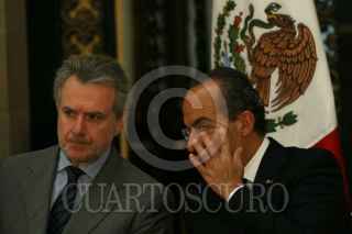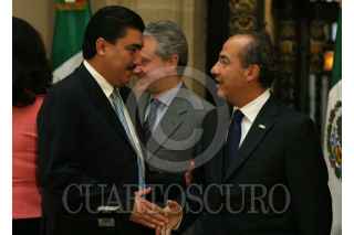 MÉXICO, D.F. 19SEPTIEMBRE2007.- El presidente Felipe Calderón Hinojosa y el gobernador de Colima, Jesús Silverio Cavazos al término de la celebración del día de protección civil en Palacio Nacional. FOTO: PAOLA HIDALGO/CUARTOSCURO.COM
