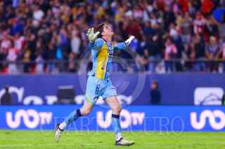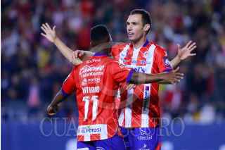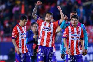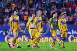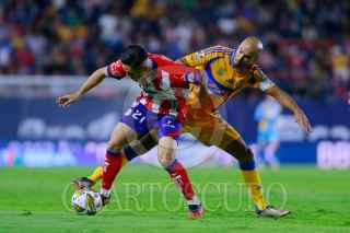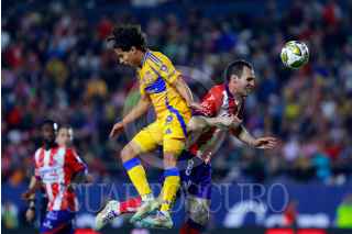 SAN LUIS POTOSÍ, SAN LUIS POTOSÍ, 28NOVIEMBRE2024.- Diego Lainez de los Tigres de la UANL y Leonardo Bonatini del Atlético San Luis disputan el balon durante el partido de ida de los cuartos de final del Torneo Apertura 2024 de la Liga BBVA MX en el Estadio Alfonso Lastras. FOTO: CÉSAR GÓMEZ/CUARTOSCURO.COM