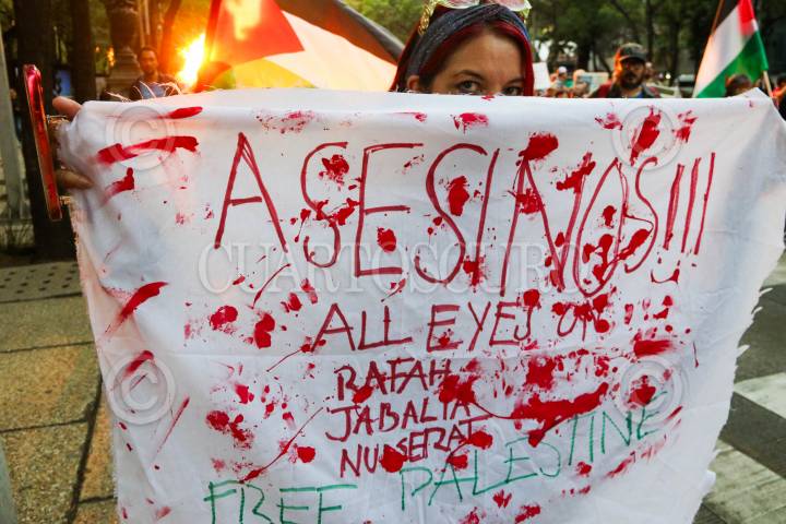 CIUDAD DE MÉXICO. 29NOVIEMBRE2024.- Decenas de ciudadanos marcharon está tarde de la embajada de Estados Unidos a la cancillería, en demanda de que el Gobierno de México, rompa relaciones con Israel; en con la consigna de que no es "Guerra es Genocidio". FOTO: VICTORIA VALTIERRA/CUARTOSCURO.COM
