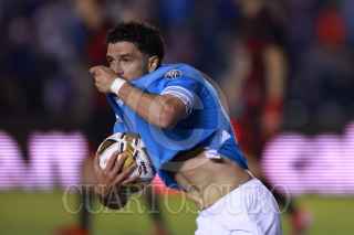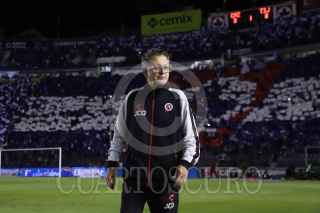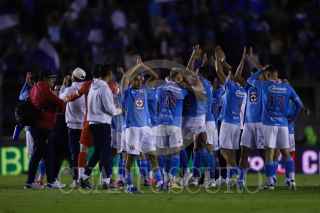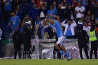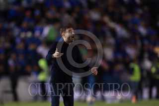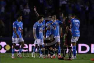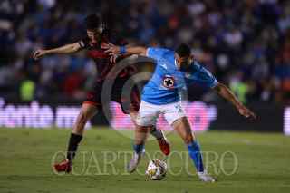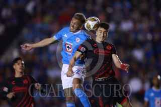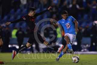 CIUDAD DE MÉXICO, 30NOVIEMBRE2024. Ángel Sepúlveda de la Máquina Celeste tira a gol dejando a tras la marca de Aarón Mejía de Xolos durante el partido de fútbol Cruz Azul vs Tijuana correspondiente a la vuelta de cuartos de final del Torneo Apertura 2024 de Liga BBVA MX, en el Estadio Ciudad de los Deportes. FOTO: EDGAR NEGRETE LIRA/CUARTOSCURO.COM