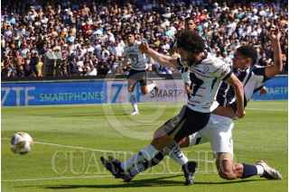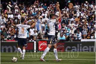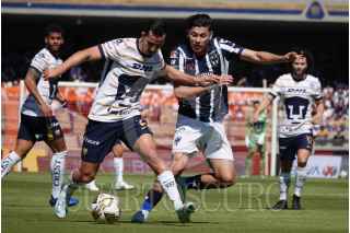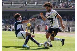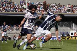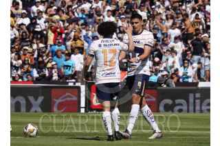 CIUDAD DE MÉXICO, 01DICIEMBRE2024.- Los jugadores de los Pumas César Huerta, medio ofensivo, y Guillermo Martínez, delantero, celebraron un gol a su favor durante los cuartos de final de la Liga MX contra el Monterrey en el Estadio Olímpico Universitario. FOTO : GRACIELA LÓPEZ /CUARTOSCURO. COM