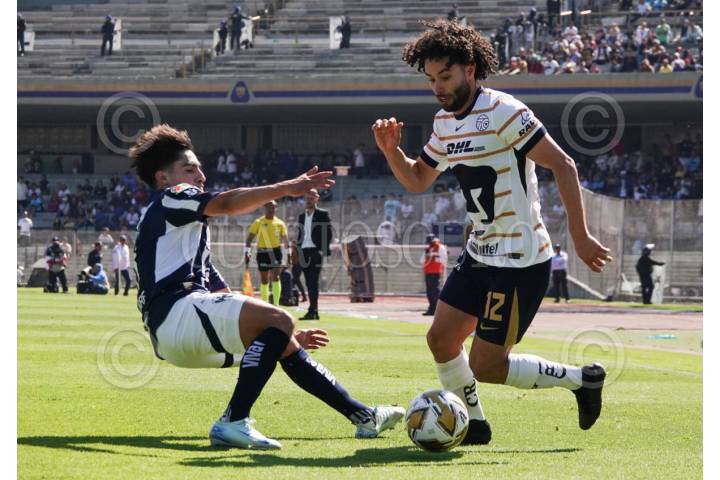 CIUDAD DE MÉXICO, 01DICIEMBRE2024.- Gerardo Arteága, defensa lateral del Monterrey, y César Huerta, medio ofensivo de Pumas, disputaron el balón durante los cuartos de final de la Liga MX, en el que el equipo del Monterrey venció 5-3 al equipo de los Pumas en el Estadio Olímpico Universitario. FOTO : GRACIELA LÓPEZ /CUARTOSCURO.COM