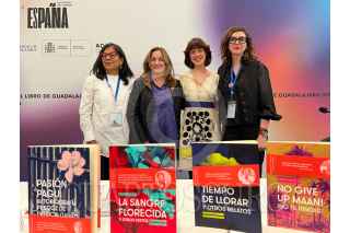 GUADALAJARA, JALISCO, 01DICIEMBRE2024.- Socorro Venegas, directora general de Publicaciones de la UNAM; la escritora e investigadora Rosa Beltrán; la escritora española Irene Vallejo, y la investigadora y docente Alejandra Amatto, durante la presentación de “Vindictas: Un lustro desafiando el canon”. Vindictas es el nombre de una colección de mujeres escritoras, poco leídas o casi olvidadas, un rescate de voces indispensables en la literatura latinoamericana, publicada por la UNAM. FOTO: ANA LUISA ANZA/CUARTOSCURO.COM