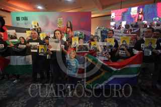 GUADALAJARA, JALISCO. 05DICIEMBRE2024.- Periodistas que nacionales e internacionales que realizan la cobertura de la edición 38 de la Feria Internacional del Libro De Guadalajara (FIL), que se lleva a cabo instalaciones de la Expo Guadalajara, en donde el País Invitado de Honor es España. Se manifestaron para solidarizarse por las y los periodistas detenidos, desaparecidos y asesinados en Gaza, esto previo a la apertura a la apertura del congreso de periodistas. FOTO: FERNANDO CARRANZA GARCIA / CUARTOSCURO.COM