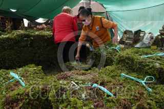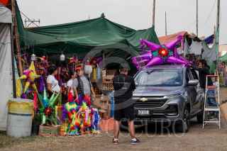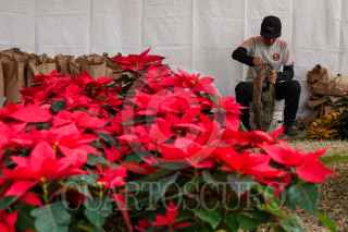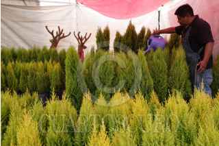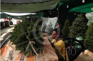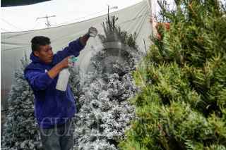 CIUDAD DE MÉXICO, 06DICIEMBRE2024.-Un joven adorno un pino con nieve artificial, en las inmediaciones de la Romería de la Central de Abastos (CEDA). Los pasillos de lonas se ubican en la calle Cazuela cerca del cruce entre Eje 5 y Eje 6 Sur día y noche para que las y los habitantes de la capital puedan surtirse en estas fiestas decembrinas. FOTO: GALO CAÑAS/CUARTOSCURO.COM