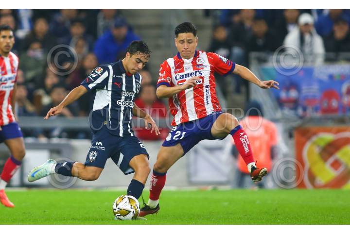 GUADALUPE, NUEVO LEÓN, 07DICIEMBRE024.- Lucas Ocampos de los Rayados del Monterrey, se disputa el balón con Óscar Macías del Atlético San Luis, en el estadio BBVA, partido de vuelta de Semifinales de la Apertura 2024. Marcador Global: Monterrey: 6 - Atlético San Luis: 2. FOTO: GABRIELA PÉREZ MONTIEL / CUARTOSCURO.COM