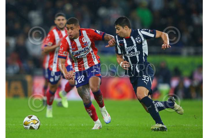 GUADALUPE, NUEVO LEÓN, 07DICIEMBRE024.- Stefan Medina de los Rayados del Monterrey, se disputa el balón con Yan Philipe del Atlético San Luis, en el estadio BBVA, partido de vuelta de Semifinales de la Apertura 2024. Marcador Global: Monterrey: 6 - Atlético San Luis: 2. FOTO: GABRIELA PÉREZ MONTIEL / CUARTOSCURO.COM