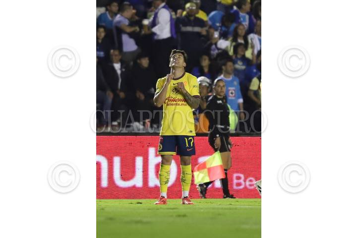 CIUDAD DE MÉXICO, 08DICIEMBRE2024.- El América lleva la delantera de un gol por cero ante el Cruz Azul, en el primer tiempo del partido de vuelta de las Semifinales de la Liga MX. En la imagen Alejandro Zendejas festeja su anotación con sus compañeros. El encuentro se lleva en el Estadio Azul. FOTO: DANIEL AUGUSTO SÁNCHEZ/CUARTOSCURO.COM
