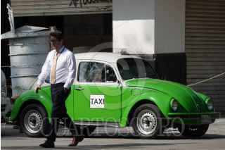 CIUDAD DE MÉXICO, 09DICIEMBRE2024.- Un hombre camina frente a un Taxi Vocho en la Alameda Central. FOTO: GRACIELA LÓPEZ/CUARTOSCURO.COM