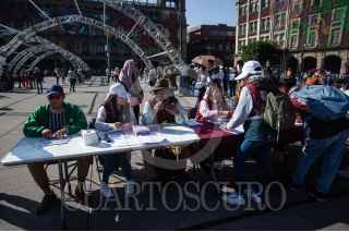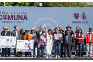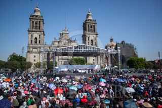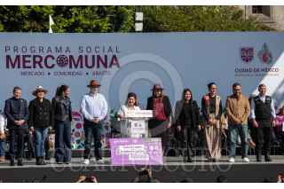 CIUDAD DE MÉXICO, 11DICIEMBRE2024.- Clara Brugada, jefa de Gobierno de la Ciudad encabezó la entrega del programa Mercomuna (Mercado, comunidad y abasto) que se llevó a cabo en la Plaza de la Constitución y consiste en tener vales para comprar con locatarios de las alcaldías de la ciudad registrados en el programa. FOTO: ANDREA MURCIA /CUARTOSCURO.COM