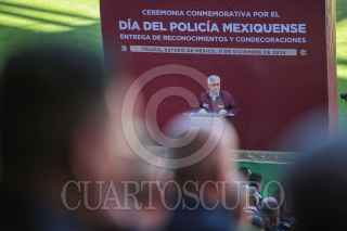 TOLUCA, ESTADO DE MÉXICO, 11DICIEMBRE2024.- Cristóbal Castañeda Camarillo, Secretario de Seguridad del Estado de México encabezó la Ceremonia Conmemorativa por el Día del Policía Mexiquense, en donde afirmó que el Operativo Enjambre marcó un precedente en la entidad mexiquense en el combate a la corrupción y “no les temblara la mano, actuarán con todo el peso de la ley”. Reconoció la labor de los efectivos mexiquenses y los invitó a seguir trabajando conforme a la ley. FOTO: CRISANTA ESPINOSA AGUILAR /CUARTOSCURO.COM