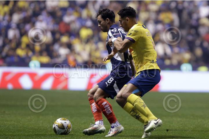 PUEBLA, PUEBLA, 12DICIEMBRE2024.- Oliver Torres y Sebastián Cáceres durante el partido entre las Águilas del América y los Rayados del Monterrey, correspondiente a la final del ida del torneo Apertura 2024 de la Liga BBVA MX, celebrado en el Estadio Cuauhtémoc. FOTO: MIREYA NOVO/ CUARTOSCURO.COM