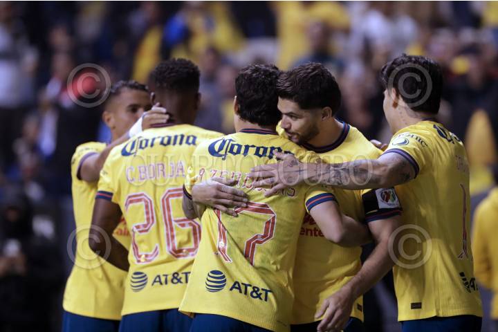 PUEBLA, PUEBLA, 12DICIEMBRE2024.-Jugadores en festejo de gol durante el partido entre las Águilas del América y los Rayados del Monterrey, correspondiente a la final del ida del torneo Apertura 2024 de la Liga BBVA MX, celebrado en el Estadio Cuauhtémoc. FOTO: MIREYA NOVO/ CUARTOSCURO.COM