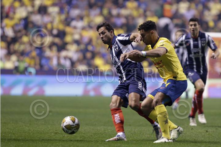 PUEBLA, PUEBLA, 12DICIEMBRE2024.- Oliver Torres y Sebastián Cáceres durante el partido entre las Águilas del América y los Rayados del Monterrey, correspondiente a la final del ida del torneo Apertura 2024 de la Liga BBVA MX, celebrado en el Estadio Cuauhtémoc. FOTO: MIREYA NOVO/ CUARTOSCURO.COM