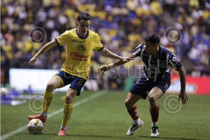 PUEBLA, PUEBLA, 12DICIEMBRE2024.- Álvaro Fidalgo y Germán Berterame durante el partido entre las Águilas del América y los Rayados del Monterrey, correspondiente a la final del ida del torneo Apertura 2024 de la Liga BBVA MX, celebrado en el Estadio Cuauhtémoc. FOTO: MIREYA NOVO/ CUARTOSCURO.COM