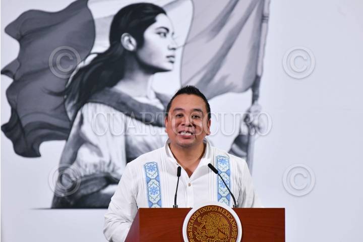 CIUDAD DE MÉXICO, 13DICIEMBRE2024.- Bulmaro Juárez Sánchez, divulgador de Lenguas Indígenas, durante su intervención en la conferencia matutina realizada en Palacio Nacional. FOTO: MARIO JASSO/CUARTOSCURO.COM