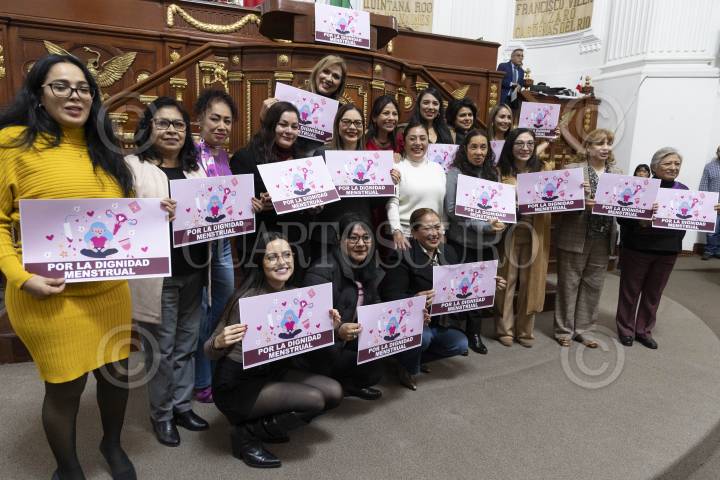 CIUDAD DE MÉXICO, 17DICIEMBRE2024.- Diputadas locales sostienen carteles con la leyenda "Por la dignidad menstrual", durante la sesión en el Congreso de la Ciudad de México. La iniciativa tiene por objetivo reconocer el derecho a la menstruación digna, al establecer que diversas instancias públicas tengan la responsabilidad de reconocer, garantizar y salvaguardar a todas las mujeres menstruantes, a través de acciones afirmativas, que informen y erradiquen el estereotipo de que la menstruación es un tema tabú. FOTO: MOISÉS PABLO/CUARTOSCURO.COM