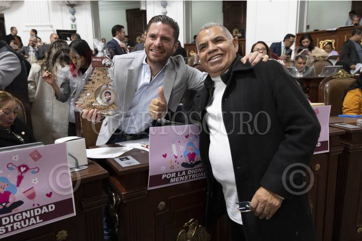CIUDAD DE MÉXICO, 17DICIEMBRE2024.- El diputado Miguel Ángel Macedo Escartín posa con el su compañero Manuel Talayero Pariente, el primero le regaló un árbol navideño de madera como parte de los festejos de la época durante la sesión en el Congreso de la Ciudad de México. FOTO: MOISÉS PABLO/CUARTOSCURO.COM
