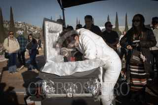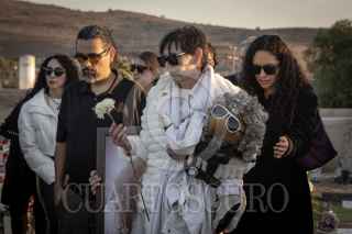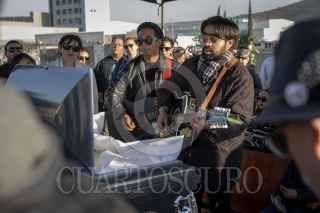 TIJUANA BAJA CALIFORNIA 17DICIEMBRE2024.- Estudiantes de Javier Bátiz tocando la guitarra y catando. A sus 80 años de edad, Javier Bátiz murió en sus sueños, así lo dio a conocer su esposa Claudia Madrid. El famoso guitarrista, icono del rock en México fue enterrado el martes 17 de diciembre en el panteón Monte de Los Olivos, como él lo había deseado, junto su padre y madre. Tras salir de la funeraria Hernandez donde velado, en caravana amigos y familiares del músico recorrieron algunos de los lugares emblemáticos que marcaron un antes y un después en la vida de Bátiz. Al llegar al panteón, un número pequeño de personas, los mas cercanos a Javier, se reunieron para darle el último adiós a la leyenda. Entre rock y lágrimas, Bátiz fue despedido como los grandes justo al caer el sol. Con una trayectoria de varias décadas, Javier fue una persona “fácil de querer, amoroso y muy humilde”, así lo describieron sus amigos. FOTO: OMAR MARTÍNEZ / CUARTOSCURO.COM