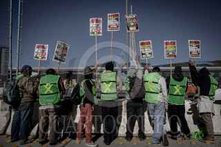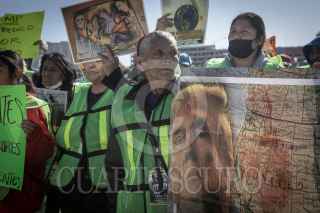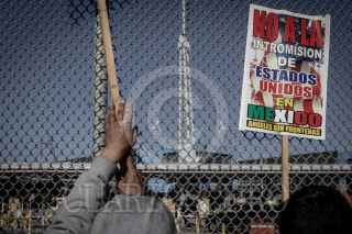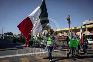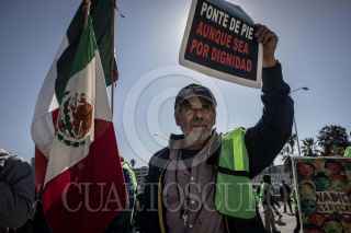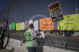 TIJUANA BAJA CALIFORNIA 18DICIEMBRE2024.-Migrante alzando un cartelón con la frase "Ponte de pie aunque sea por dignidad". Con el propósito de conmemorar el Día del Migrante, un grupo de personas en contexto de movilidad marcharon desde el albergue juventud 2000 ubicado en la Zona Norte hasta la garita de San Ysidro. El contingente de alrededor de 150 personas de todas las edades, entre ellos niños y mujeres, de diferentes nacionalidades, se manifestaron a un costado del acceso vehicular al país vecino. Con pancartas en las manos, comenzaron a gritar consignas en contra del ex presidente Donald Trump, quien tomará oficialmente la presidencia a finales del mes de enero del 2025. Con cinta adhesiva, pegaron algunas de las cartulinas que llevaban en el cerco que separa a México de Estados Unidos. FOTO: OMAR MARTÍNEZ / CUARTOSCURO.COM