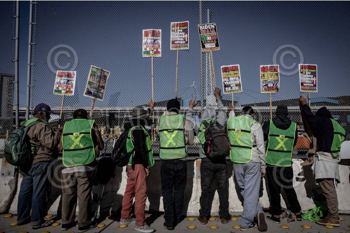 TIJUANA BAJA CALIFORNIA 18DICIEMBRE2024.-Un grupo de migrantes frente al cerco que divide a México de Estados Unidos. Con el propósito de conmemorar el Día del Migrante, un grupo de personas en contexto de movilidad marcharon desde el albergue juventud 2000 ubicado en la Zona Norte hasta la garita de San Ysidro. El contingente de alrededor de 150 personas de todas las edades, entre ellos niños y mujeres, de diferentes nacionalidades, se manifestaron a un costado del acceso vehicular al país vecino. Con pancartas en las manos, comenzaron a gritar consignas en contra del ex presidente Donald Trump, quien tomará oficialmente la presidencia a finales del mes de enero del 2025. Con cinta adhesiva, pegaron algunas de las cartulinas que llevaban en el cerco que separa a México de Estados Unidos. FOTO: OMAR MARTÍNEZ / CUARTOSCURO.COM