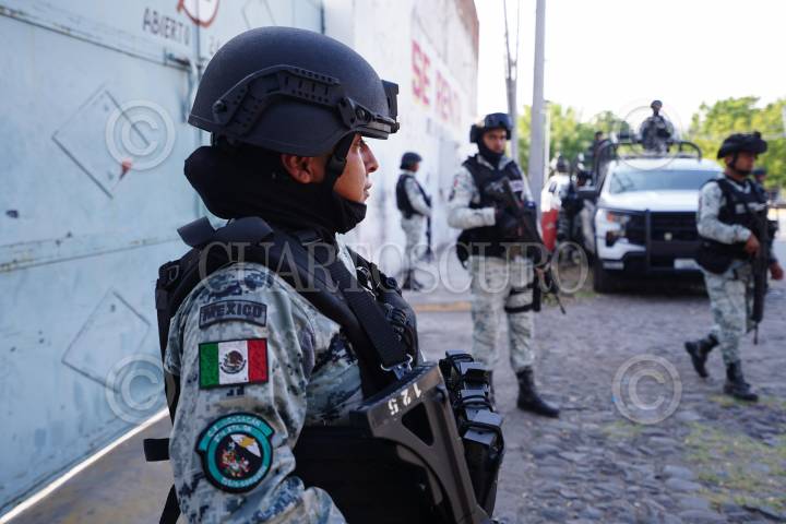 BUENAVISTA, MICHOACÁN, 18DICIEMBRE2024.- Elementos de la Guardia Nacional custodian la Semefo en donde están los cuerpos de los dos soldados que murieron tras la explosión de una mina terrestre, de fabricación casera, en un supuesto campo minado ubicado en los límites de los municipios de Buenavista Tomatlán y Apatzingán, en la región de Tierra Caliente. FOTO: JUAN JOSÉ ESTRADA SERAFÍN/ CUARTOSCURO.COM