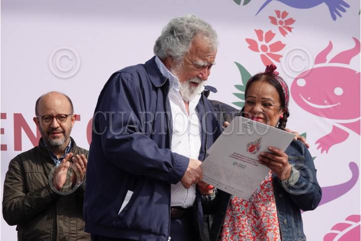 CIUDAD DE MÉXICO, 20DICIEMBTE2024.- Alejandro Encinas, titular de Planeación y Ordenamiento Territorial de CDMX, entregó a una beneficiaria las escrituras de su propiedad durante la entrega de Escrituras y Testamentos en la Plaza de la Constitución. FOTO: GRACIELA LÓPEZ/CUARTOSCURO.COM