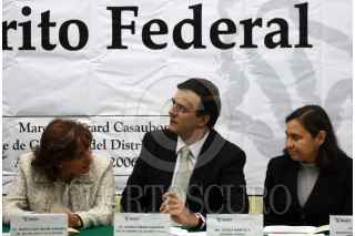 MÉXICO,D,F.,26SEPTIEMBRE2007.-Martha Lucia Micher,Directora General del Instituto de las Mujeres, Marcelo Ebrard Jefe de Gobierno del Distrito Federal,Leticia Bonifaz Consejera Jurídica, firman la iniciativa de ley , de acceso de las mujeres a una vida libre de violencia. FOTO:SASHENKA GUTIERREZ/CUAROTSCURO.COM