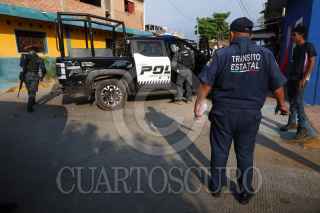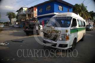 TAPACHULA, CHIAPAS, 22DICIEMBRE2024.- Un percance vial entre una patrulla de la Fuerza de Reacción Inmediata Pakal (FRIP) y un colectivo de la ruta Palmeras dejó como saldo tres pasajeros lesionados y un elemento policiaco herido. Este es el segundo incidente del día en el que se ve involucrada una unidad de la FRIP. FOTO: DAMIÁN SÁNCHEZ/CUARTOSCURO.COM
