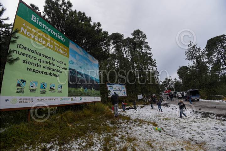 ZINACANTEPEC, ESTADO DE MÉXICO, 23DICIEMBRE2024.- Turistas de distintos puntos de la entidad mexiquense y de otros estados acudieron al Nevado de Toluca para disfrutar del paisaje nevado, algunos pudieron disfrutar de la nieve en el Parque de los Venados y otros se quedaron en la entrada principal y tuvieron que caminar. La Secretaría de Medio Ambiente estatal y CONANP emitieron una advertencia ante el mal tiempo e informaron que se encuentra cerrado el acceso al Volcán Xinantécatl hasta nuevo aviso. FOTO: CRISANTA ESPINOSA AGUILAR /CUARTOSCURO.COM