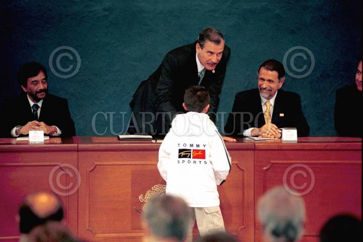 Al termino de la ceremonia por el XXXV aniversario del Congreso del Trabajo, el presidente Vicente Fox y el lider de la CTM Leonardo Rodríguez Alcaine saludan a los asistentes a dicho evento. FOTO: Victoria Valtierra/CUARTOSCURO.COM