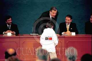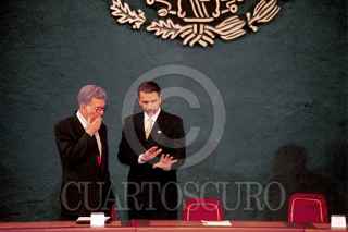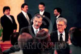 Al termino de la ceremonia por el XXXV aniversario del Congreso del Trabajo, el presidente Vicente Fox y el lider de la CTM Leonardo Rodríguez Alcaine saludan a los asistentes a dicho evento. FOTO: Victoria Valtierra/CUARTOSCURO.COM