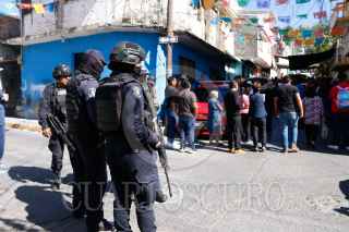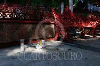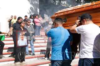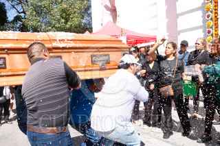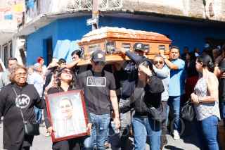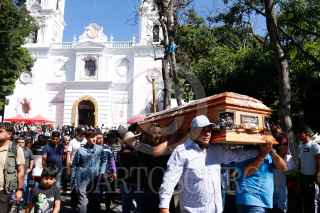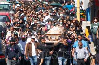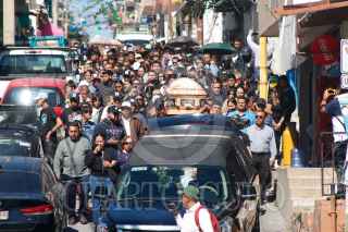 CHILPANCINGO, GUERRERO, 26DICIEMBRE2024.- Un cortejo fúnebre y un nulo dispositivo de seguridad fue la manera en que despidieron al presidente del Patronato de la Feria de San Mateo, Navidad y Año Nuevo Martín Roberto Ramírez Ruiz, quien fue asesinado el pasado 24 de diciembre en la plazoleta del Barrio de San Mateo. Con danzas de Tlacololeros, mariachi y solo 6 policías del estado, un contingente de vecinos, promotores culturales y familiares partieron al mediodía con dirección a la Iglesia del mismo barrio. Una vez que sus familiares lo despidieron en la capilla, el féretro fue llevado hasta la Junta de Conciliación Arbitraje, dónde laboraba, para ser despedido por sus compañeros de trabajo. Finalmente los restos fueron trasladado al panteón municipal para su sepultura, autoridades del ayuntamiento de Chilpancingo confirmaron que la feria no será suspendida, pese a que artistas y comerciantes decidieron retirarse tras el homicidio, mientras que los que decidieron quedarse tendrán resguardo de los tres niveles de gobierno. FOTO: DASSAEV TÉLLEZ ADAME/CUARTOSCURO.COM