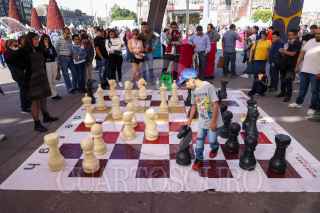 CIUDAD DE MÉXICO, 29DICIEMBRE2024.- Niños juegan una partida de ajedrez con piezas gigantes en el Zócalo. FOTO: MOISÉS PABLO/CUARTOSCURO.COM