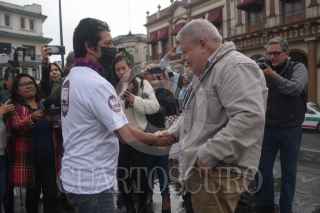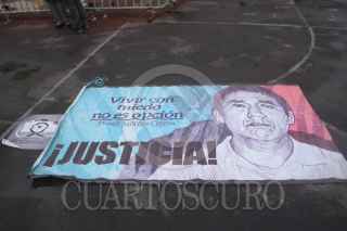 XALAPA, VERACRUZ, 02ENERO2025.- Se cumplen 10 años del asesinato del periodista Moisés Sánchez, su hijo Jorge protestó en la Plaza Lerdo para exigir justicia, ahí coincidió con el senador Manuel Huerta a quien le pidió un acercamiento con la gobernadora Rocío Nahle para poder avanzar en las investigaciones del caso de su padre. FOTO: YERANIA ROLÓN/CUARTOSCURO.COM
