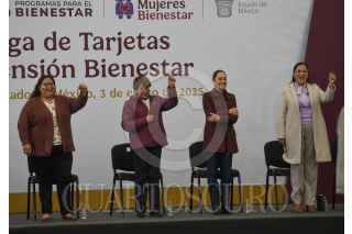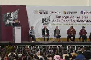 ZINACANTEPEC, ESTADO DE MÉXICO, 03ENERO2025.- Claudia Sheimbaun, Presidenta de México acompañada por Delfina Gómez Álvarez, Gobernadora del Estado de México, Ariadna Montiel Reyes, Secretaria del Bienestar y Citlali Hernández Mora Secretaria de las mujeres, encabezaron la entrega de Tarjetas de la Pensión Mujeres Bienestar a nivel nacional, con la cual se beneficiarán 900 mil mujeres de 63 y 64 años de edad, recibirán 3 mil pesos bimestrales, el evento fue realizado en Ciudad Deportiva Juan Fernández Albarrán. FOTO: CRISANTA ESPINOSA AGUILAR /CUARTOSCURO. COM