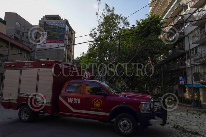 CIUDAD DE MÉXICO, 03ENERO2025.- Un árbol de casi 25 metro desprendió dede la raíz para quedar suspendido y solo sostener sus grandes ramas por los cables de luz de la calle Homero a su cruce con Platón. Ala lugar llegaron elementos del cuerpo Heroico de Bomberos y protección civil para atender la emergencia. FOTO: ROGELIO MORALES /CUARTOSCURO.COM