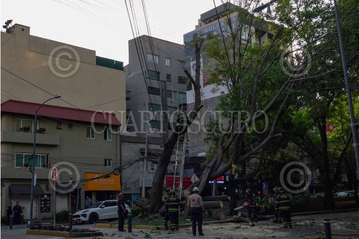 CIUDAD DE MÉXICO, 03ENERO2025.- Un árbol de casi 25 metro desprendió dede la raíz para quedar suspendido y solo sostener sus grandes ramas por los cables de luz de la calle Homero a su cruce con Platón. Ala lugar llegaron elementos del cuerpo Heroico de Bomberos y protección civil para atender la emergencia. FOTO: ROGELIO MORALES /CUARTOSCURO.COM
