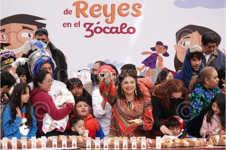 CIUDAD DE MÉXICO, 05ENERO2025.- Clara Brugada, jefa de Gobierno, mostró el muñequito de la Rosca de Reyes en la plancha del Zócalo. FOTO: GRACIELA LÓPEZ/CUARTOSCURO.COM