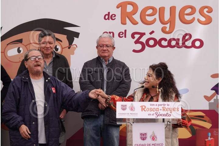 CIUDAD DE MÉXICO, 05ENERO2025.- En el marco de la llegada de los Reyes Magos, Paco Ignacio Taibo II, director ejecutivo de Fondo de Cultura Económica, y Clara Brugada, jefa de Gobierno, durante la Megarosca de Reyes en la plancha del Zócalo. FOTO: GRACIELA LÓPEZ/CUARTOSCURO.COM