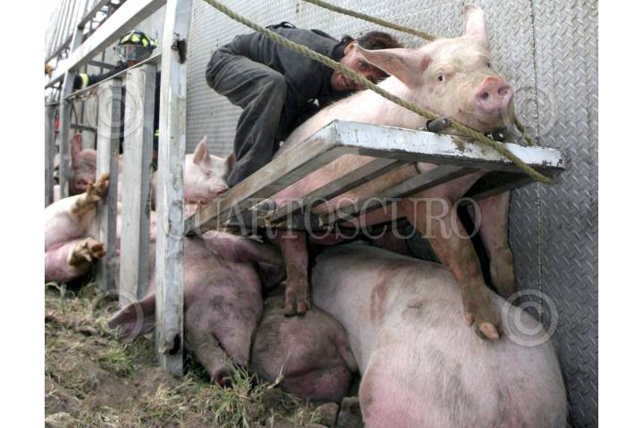 MÉXICO, D.F., 27SEPTIEMBRE2007.- Un trailer que transportaba decenas de cerdos se volco enfrente del Panteón Jardines del Recuerdo sobre la avenida del Durazno en Tlanepantla cuando el chofer quiso tomar una curva sin precaución , los bomberos acudieron al lugar para recoger los cadaveres de los puercos que quedaron prensados entre los fierros de remolque. FOTO: PEDRO MARRUFO/CUARTOSCURO.COM