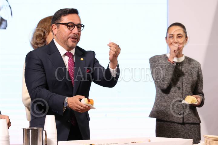 CIUDAD DE MÉXICO, 06ENERO2025.- Arturo Reyes Sandoval, director del IPN y Claudia Sheinbaum, Presidenta de México, partieron la rosca de reyes al finalizar la mañanera del pueblo. FOTO: MOISÉS PABLO/CUARTOSCURO.COM