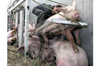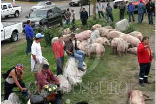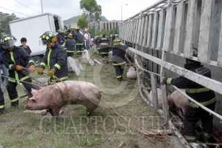 MÉXICO, D.F., 27SEPTIEMBRE2007.- Un trailer que transportaba decenas de cerdos se volco enfrente del Panteón Jardines del Recuerdo sobre la avenida del Durazno en Tlanepantla cuando el chofer quiso tomar una curva sin precaución , los bomberos acudieron al lugar para recoger los cadaveres de los puercos que quedaron prensados entre los fierros de remolque. FOTO: PEDRO MARRUFO/CUARTOSCURO.COM