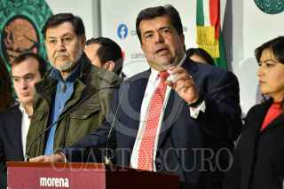 CIUDAD DE MÉXICO, 08ENERO2025.- Pedro Haces, diputado de Morena, y Gerardo Fernández Noroña, presidente de la mesa directiva del Senado de la República, junto a legisladores de la mayoría, ofrecieron conferencia de prensa, para referirse a temas de la agenda política y que serán discutidos en la primera sesión ordinaria de la Comisión Permanente del Congreso de la Unión. FOTO: MARIO JASSO/CUARTOSCURO.COM
