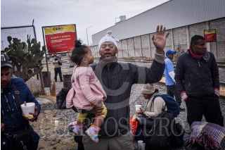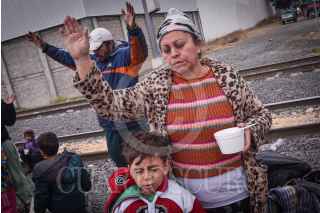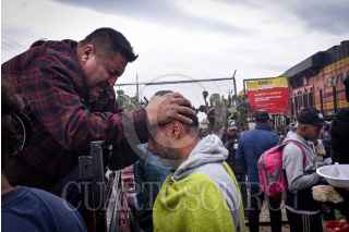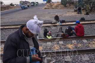 AGUASCALIENTES, AGUASCALIENTES, 09ENERO2024.- Un grupo de aproximadamente 60 migrantes, en su mayoría venezolanos, abordan el tren de carga conocido como "La Bestia", en su camino al norte del continente. Durante una parada en el camino, un pastor cristiano ofreció a los viajeros oraciones y comida caliente. FOTO: PEDRO ANZA /CUARTOSCURO.COM