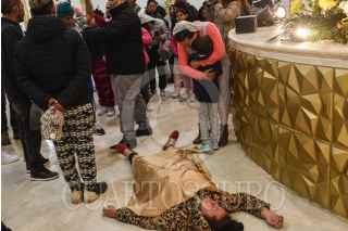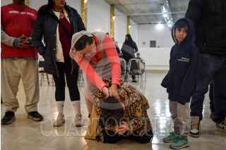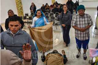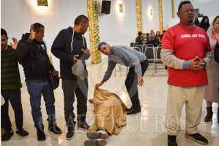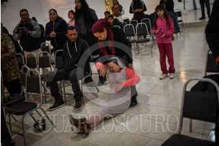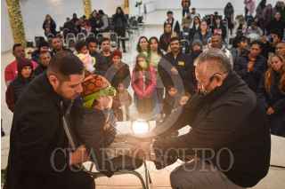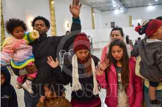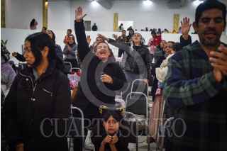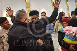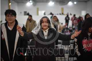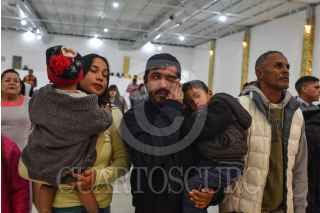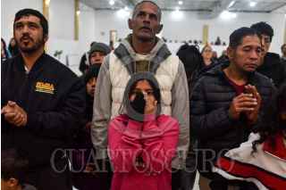 TORREÓN, COAHUILA, 09ENERO2025.- Un grupo de migrantes, en su mayoría venezolanos, que descansaba en un albergue de la ciudad, fueron invitados por una organización cristiana a una misa. En la ceremonia, a la que a su vez asistieron devotos locales, el pastor ofreció una palabras de apoyo a los migrantes y, de paso, realizó oraciones y peticiones para sanarlos de enfermedades e infortunios. FOTO: PEDRO ANZA /CUARTOSCURO.COM