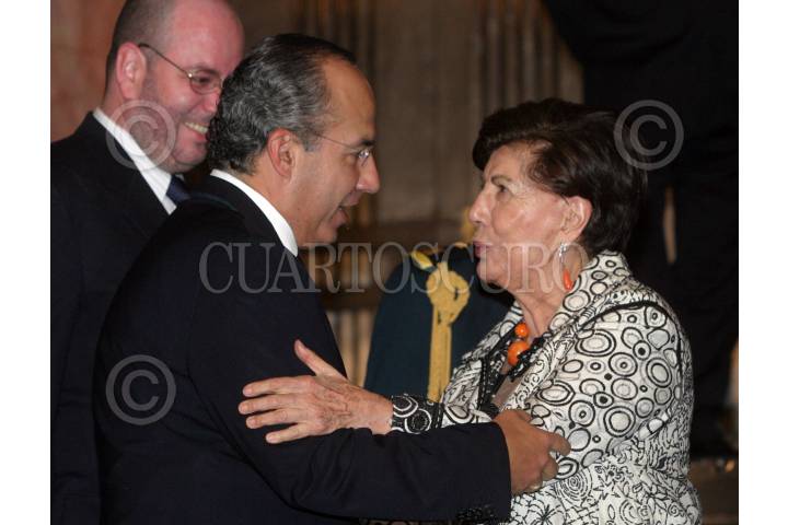 MÉXICO, D.F., 27SEPTIEMBRE2007.- Felipe Calderón Hinojosa, Presidente de México saluda a Sissi Harp Calderoni, directora de la Fundación Alfredo Harp Helú, durante la inauguración de la exposición pictorica Diego Rivera: Epopeya Mural 1886-1957 en el Palacio de Bellas Artes. FOTO: MOISÉS PABLO/CUARTOSCURO.COM