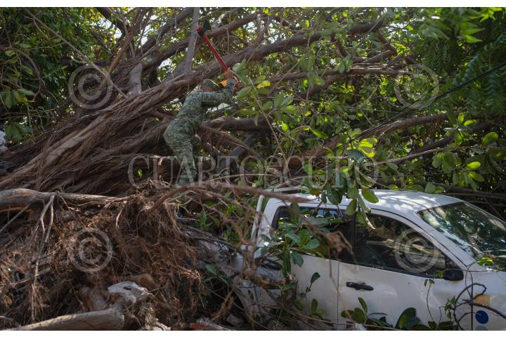 VERACRUZ, VERACRUZ, 10ENERO2025.- Un árbol de grandes dimensiones cayó sobre tres vehículos debido a las fuertes rachas de viento ocasionadas por el frente frío número 22, por lo que el Ejército Mexicano realizó labores conforme a el plan DN-lll-E. La Secretaría de Protección Civil informó sobre el ingreso del frente estado de Veracruz, el cual ocasionará un descenso considerable en las temperaturas y rachas máximas de 80 a 95 km/hr este fin de semana. FOTO: VICTORIA RAZO/CUARTOSCURO.COM