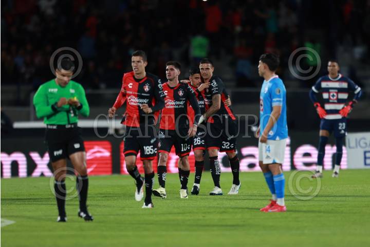 CIUDAD DE MÉXICO, 11ENERO2025. Uros Durdevic de los Zorros es felicitado por sus compañeros luego de conseguir el empate a un gol durante el partido de fútbol Cruz Azul vs Atlas correspondiente a la jornada 1 del Torneo Clausura 2025 de Liga BBVA MX, en el Estadio Olímpico Universitario. FOTO: EDGAR NEGRETE LIRA/CUARTOSCURO.COM