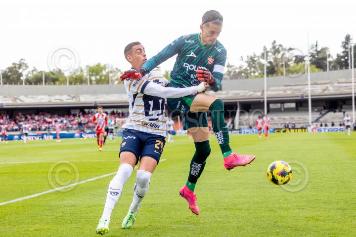 CIUDAD DE MÉXICO, 12ENERO2025.- Los Pumas de la UNAM vencieron 2-1 al Necaxa en su casa, el Estadio Olímpico Universitario, partido correspondiente a la jornada 1 de la Liga MX. Rogelio Funes Mori (Pumas) abraza al portero Luis Ezequiel Unsain (Necaxa) durante una salida del arquero del área chica. FOTO: MOISÉS PABLO/CUARTOSCURO.COM